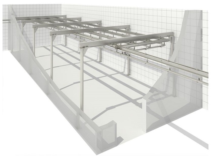 Подвесной трубчатый путь с несущей конструкцией предназначен для транспортировки и хранения туш, полутуш, четвертин и отрубов КРС, свиней и МРС на троллеях скольжения или качения в цехах убоя, переработки и холодильных камерах.