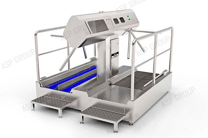 Модуль контроль входа. Необходимо последовательное выполнение действий по дезинфекции рук и обуви, после чего происходит разблокировка турникета для прохождения в производственную зону. Турникет блокирует выход из производственной зоны.